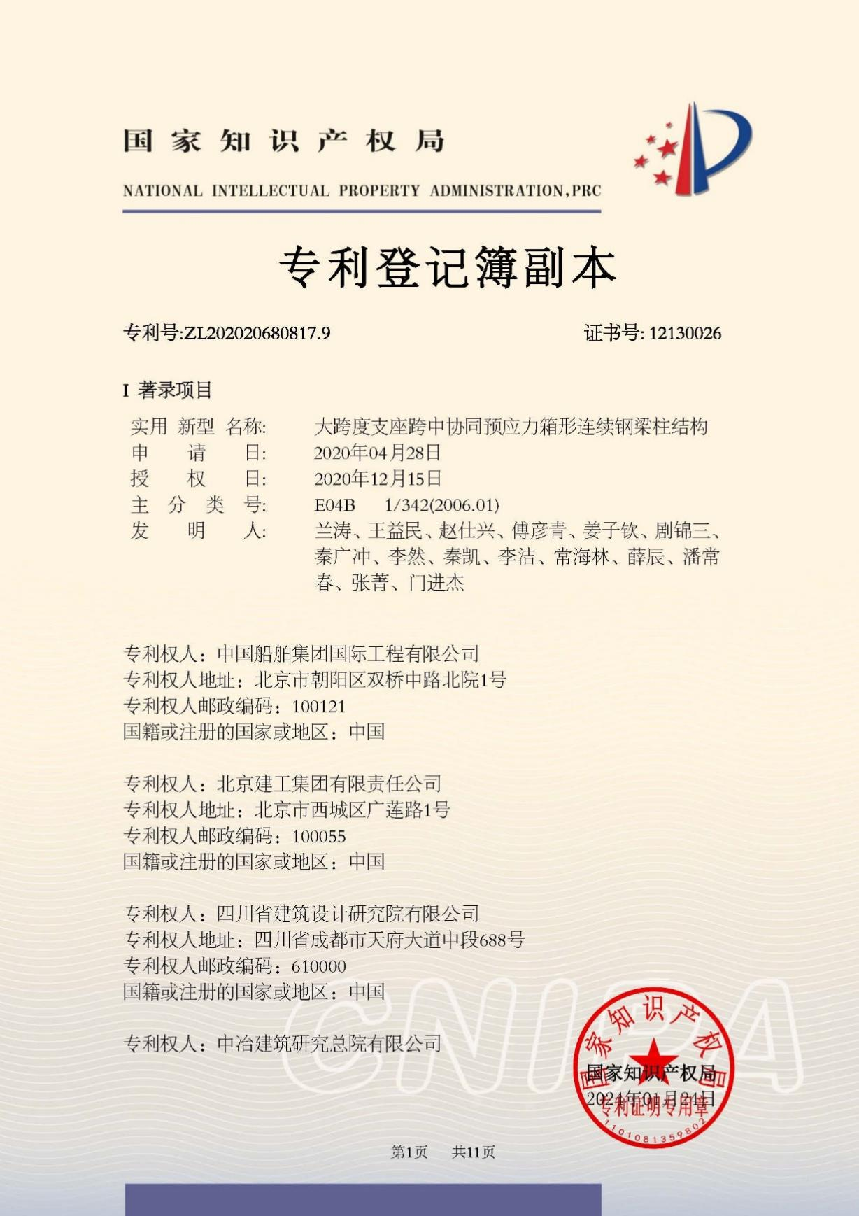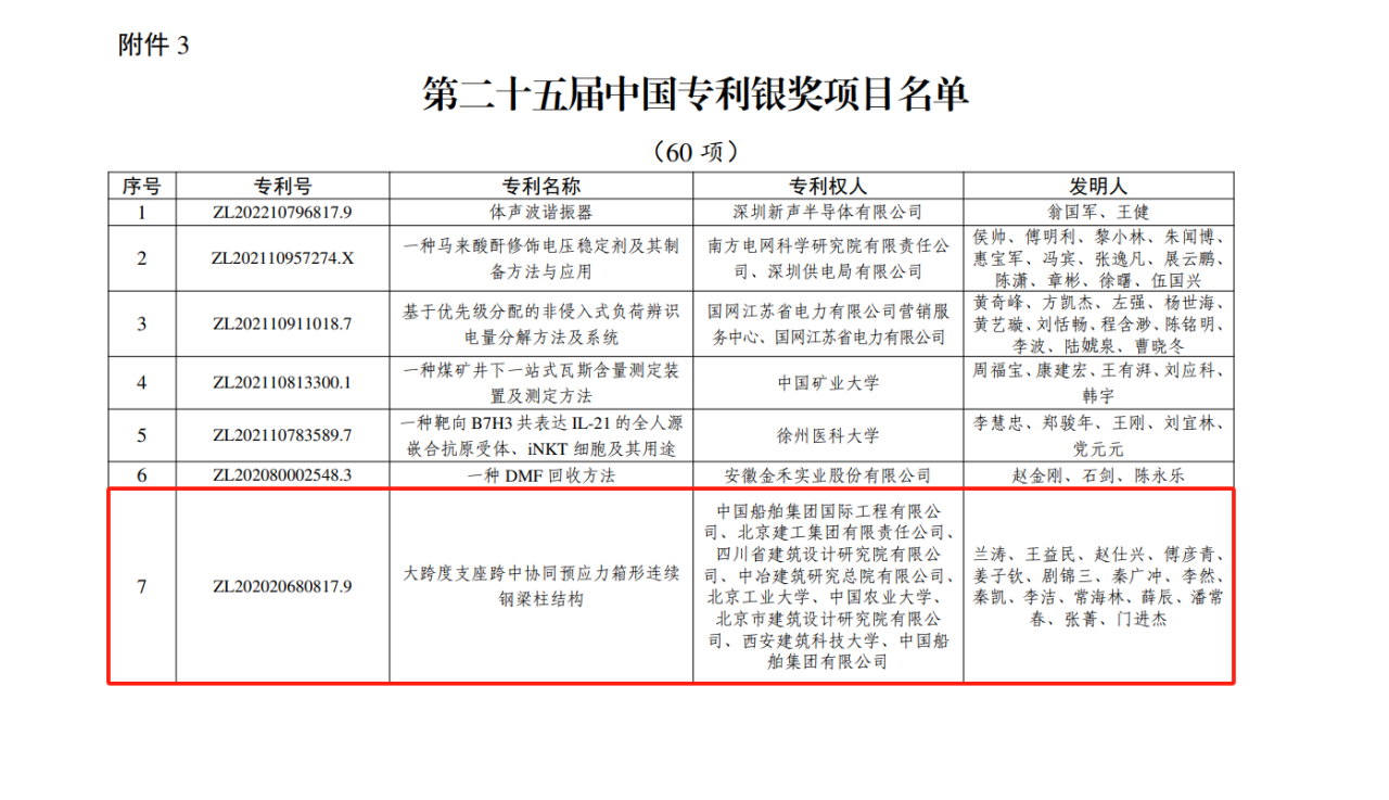 今年6月,國家知識產(chǎn)權局公布第二十五屆中國專(zhuān)利獎授獎決定,由中船集團旗下中船國際工程主導申報的專(zhuān)利《大跨度支座跨中協(xié)同預應力箱形連續鋼梁柱結構》(專(zhuān)利號:ZL202020680817.9)榮獲本屆中國專(zhuān)利銀獎。該獎項由國家知識產(chǎn)權局與世界知識產(chǎn)權組織聯(lián)合設立,是我國專(zhuān)利領(lǐng)域的最高榮譽(yù)。今天,讓我們走進(jìn)中船國際工程鋼結構工程設計與研發(fā)團隊,聆聽(tīng)他們的奮斗故事。