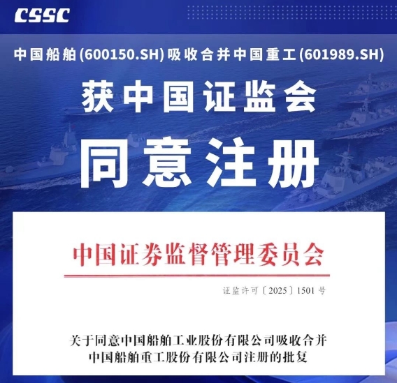 7月18日,中國證監會(huì )發(fā)布《關(guān)于同意中國船舶工業(yè)股份有限公司吸收合并中國船舶重工股份有限公司注冊的批復》,同意中國船舶工業(yè)股份有限公司換股吸收合并中國船舶重工股份有限公司。