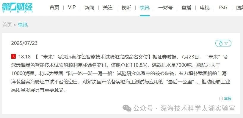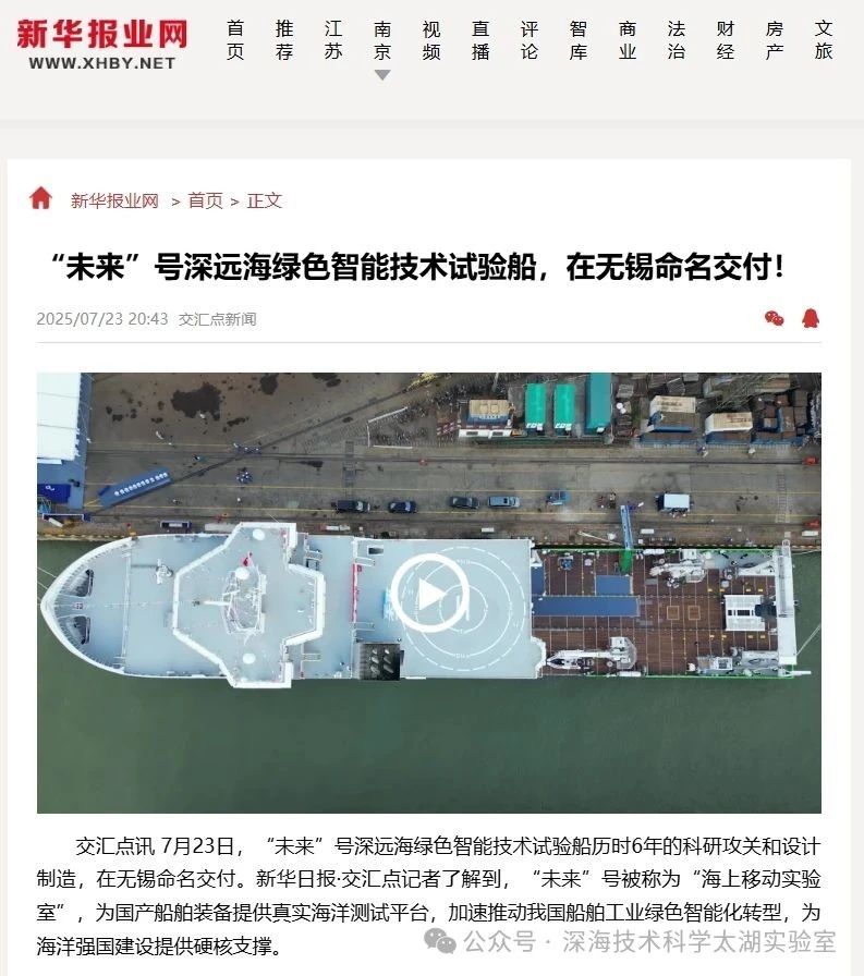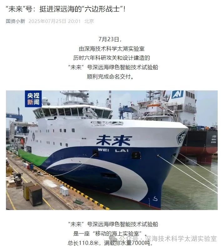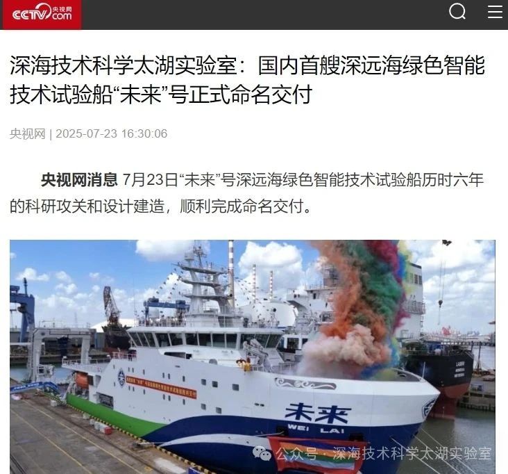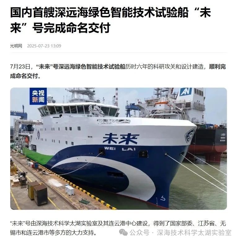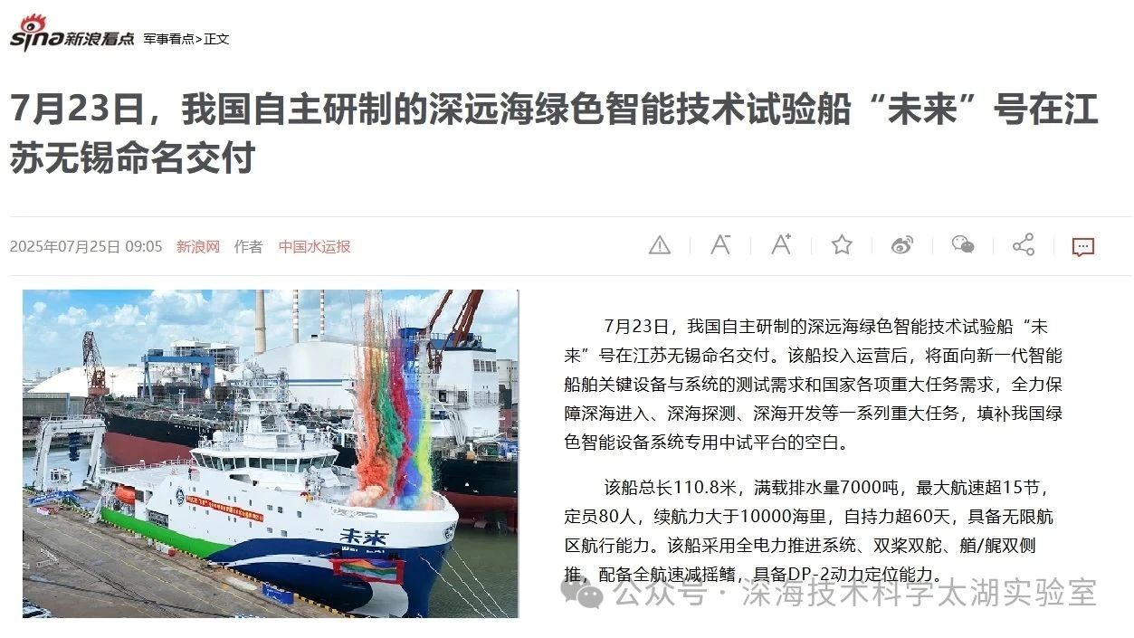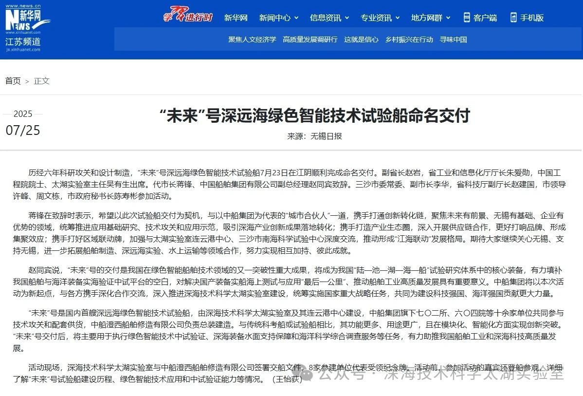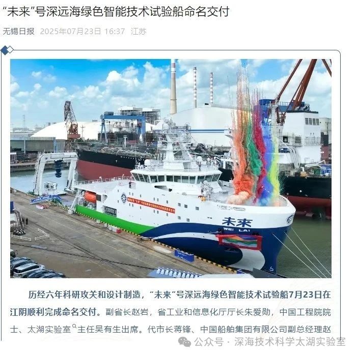 7月23日,由深海技術(shù)科學(xué)太湖實(shí)驗室歷時(shí)六年科研攻關(guān)和設計建造的“未來(lái)”號正式命名交付。中船集團旗下七〇二所、上船院、七〇四所、七一一所、七一二所等十余家單位共同參與技術(shù)攻關(guān)和配套供貨,中船澄西負責總裝建造人民日報、新華社、央視新聞、科技日報等主流媒體共同聚焦這一“國之重器”。