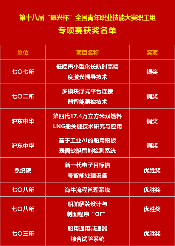 11月15日,第十八屆“振興杯”全國青年職業(yè)技能大賽職工組全國決賽在沈陽(yáng)落下帷幕,中國船舶集團青年取得主體賽(職業(yè)技能競賽)“1銀2銅7優(yōu)勝獎”、專(zhuān)項賽(創(chuàng )新創(chuàng )效競賽)“1銀3銅4優(yōu)勝獎”的好成績(jì)。其中,黃埔文沖吳道升、七〇七所“低噪聲小型化長(cháng)航時(shí)高精度激光慣導技術(shù)”項目分獲銀獎,在“青春競技場(chǎng)”上展現了船舶青年的自信卓越風(fēng)采。