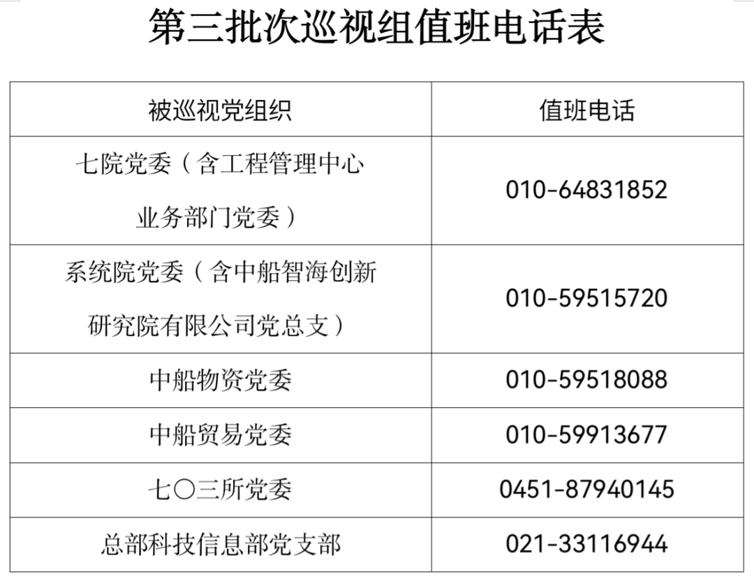 巡視期間,集團公司黨組巡視組設置值班電話(huà)和聯(lián)系信箱,主要受理反映被巡視黨組織領(lǐng)導班子及其成員、下一級黨組織領(lǐng)導班子主要負責人和重點(diǎn)崗位領(lǐng)導干部問(wèn)題的來(lái)信、來(lái)電、來(lái)訪(fǎng),重點(diǎn)關(guān)注違反政治紀律、組織紀律、廉潔紀律、群眾紀律、工作紀律、生活紀律以及巡視整改等方面問(wèn)題反映。第三批次巡視受理信訪(fǎng)截止時(shí)間為9月22日。